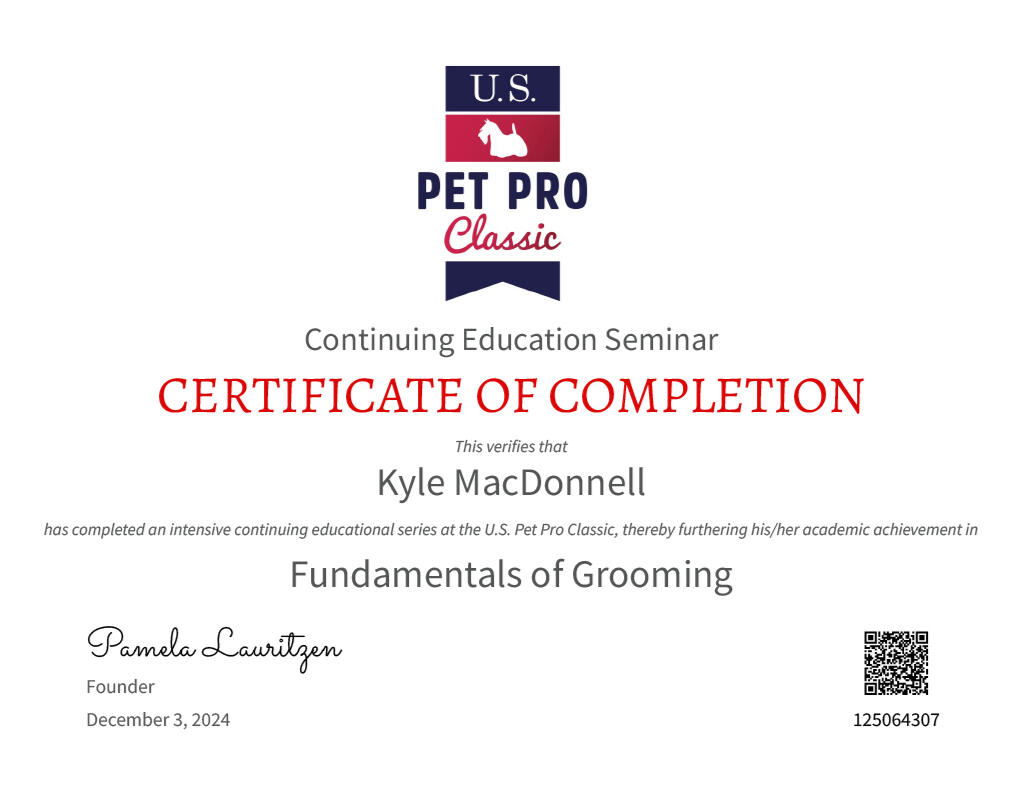 I've had the good fortune of living very close to one of the most amazing grooming expos, US Pet Pro Classic! Since taking up grooming I've made an effort to attend every single year.So far I've attended 2024, 2025, and have plans to attend 2026 in the future. It's been a wonderful source of continuing education, as you can see by my certificates below.