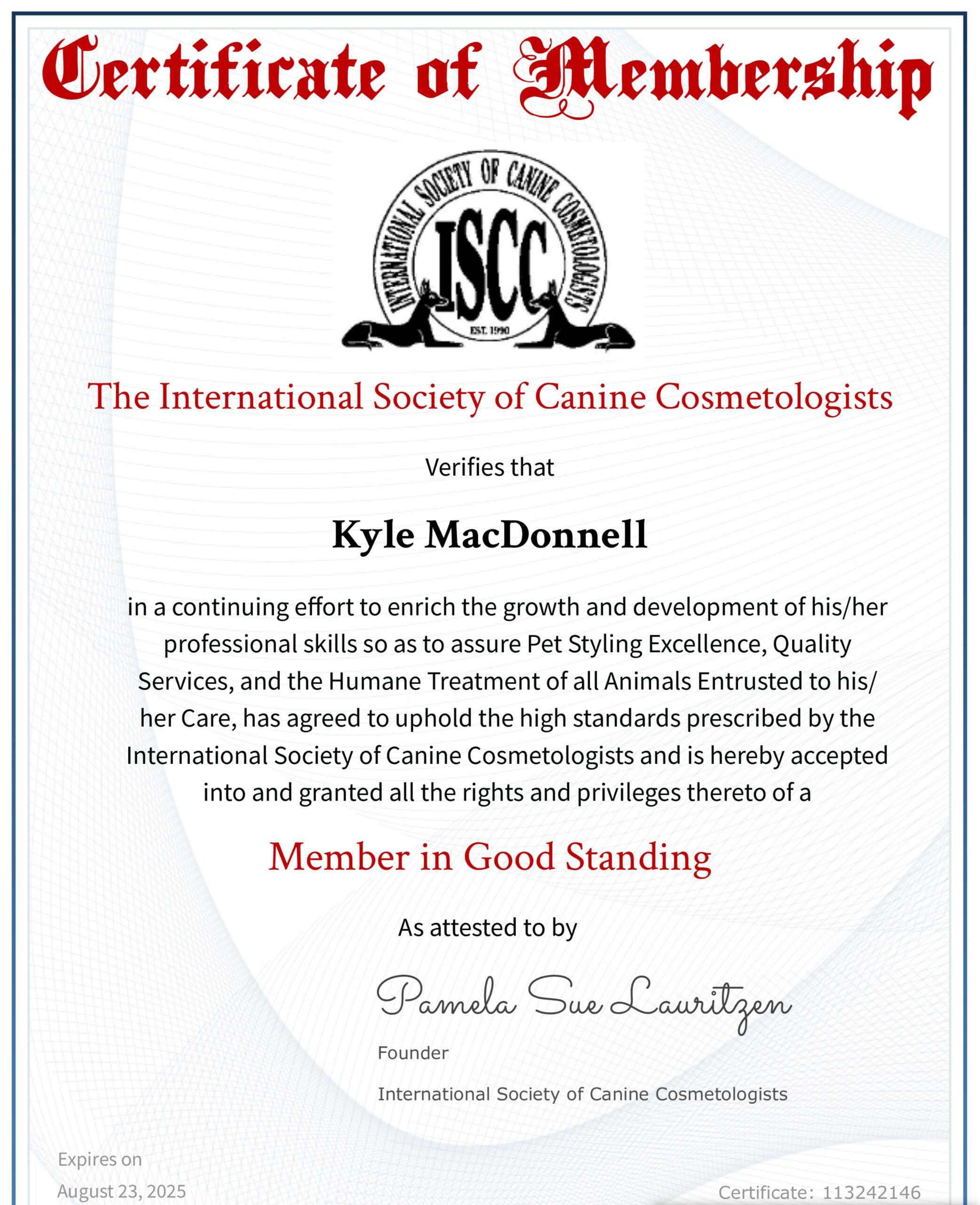 International Society of Canine Cosmetologists (ISCC) Certification - Member in Good Standing (2024)