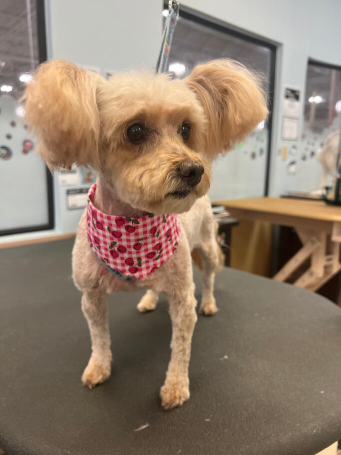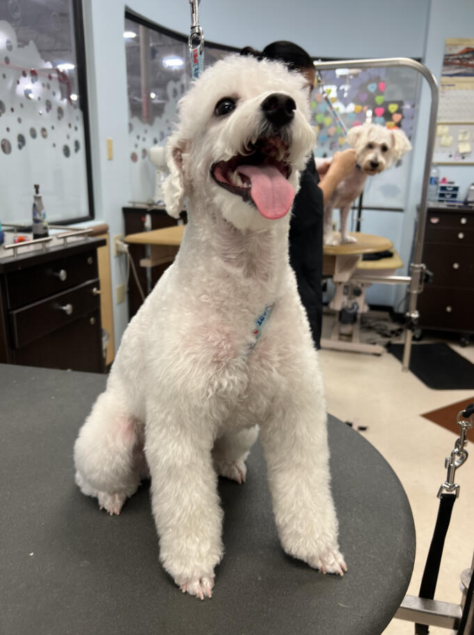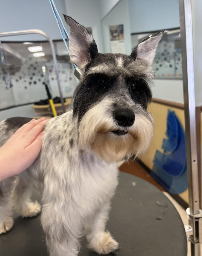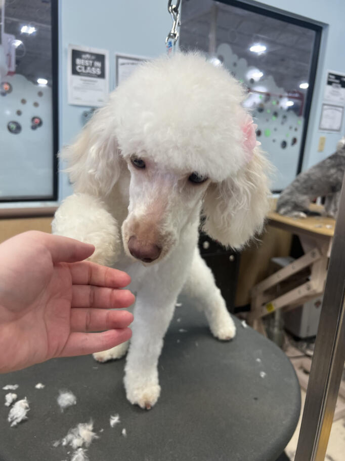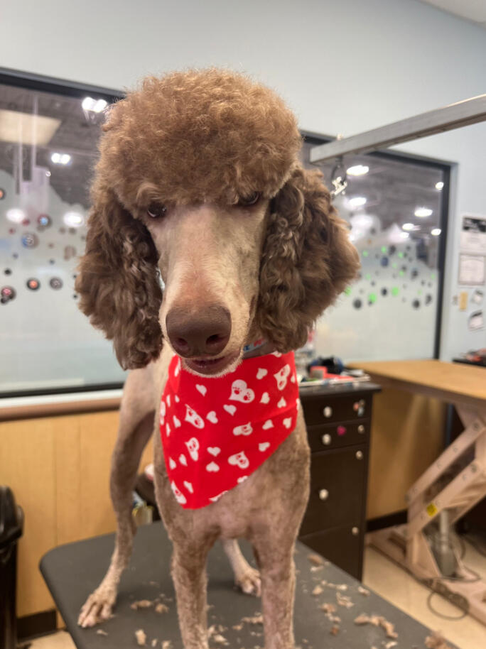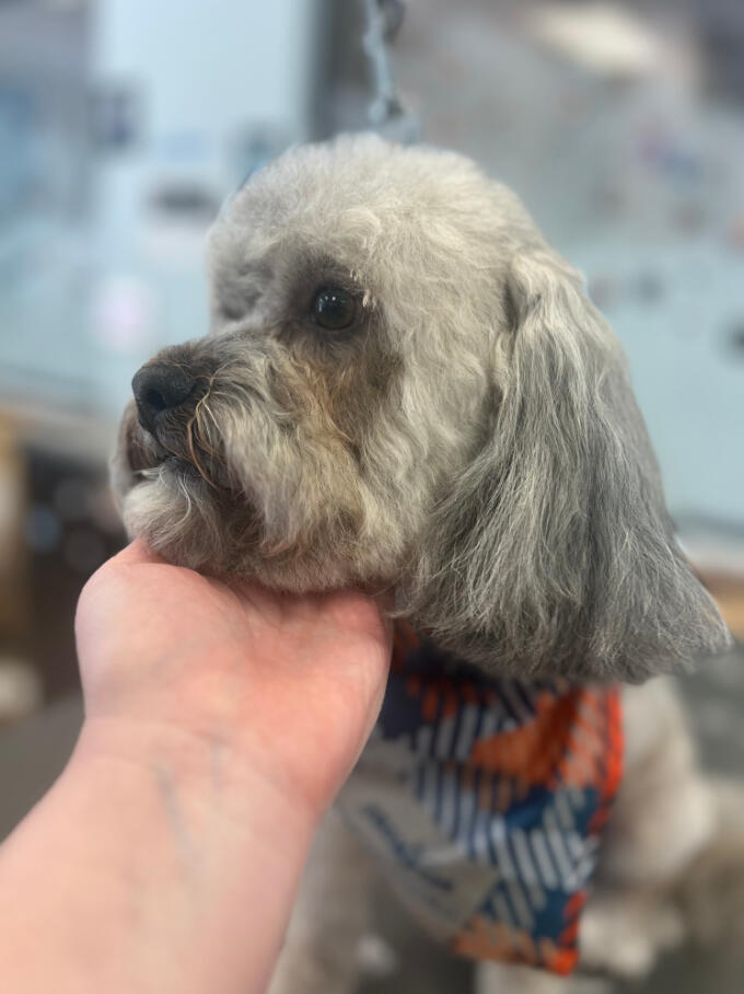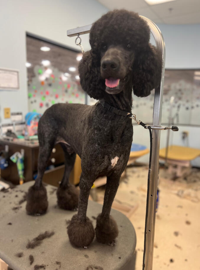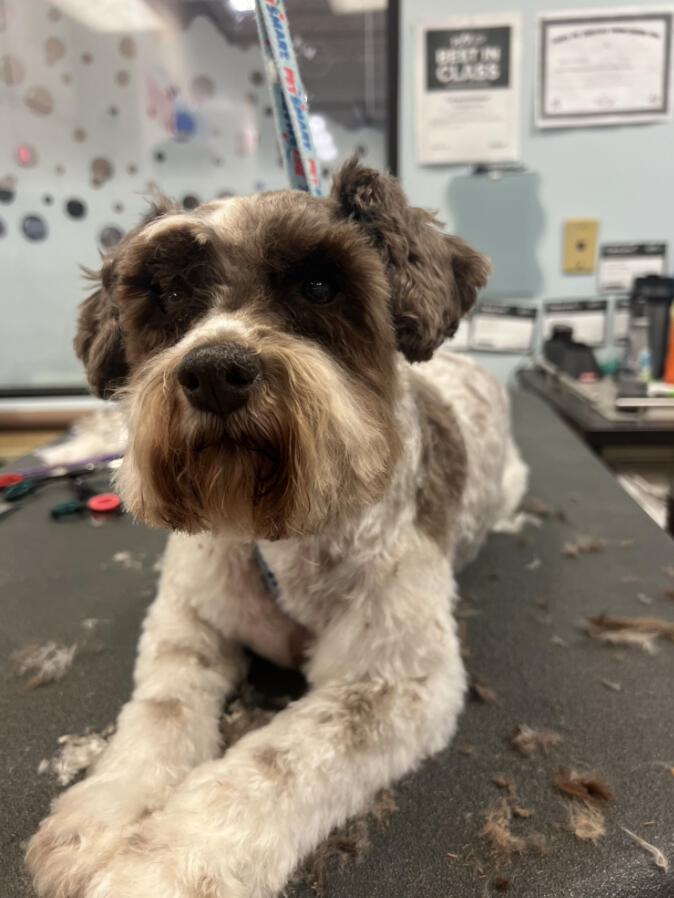 I started grooming after finding a stray Miniature Poodle that we would eventually adopt, who we named Hopper! Starting from home grooming, I eventually applied to a grooming apprenticeship at the salon I'm in now, so we have Hopper to thank for my career change!He's also been a wonderful practice dog, putting up with all sorts of goofy, unfitting haircuts. (I'm still sort of partial to the schnauzer skirt look, but don't tell him that.)